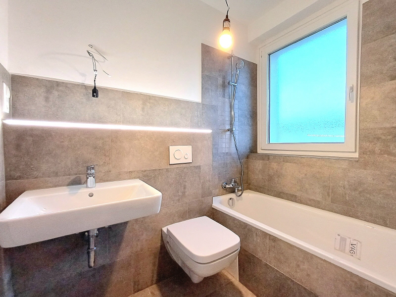 - modern gefliestes Bad mit Badewanne und Fenster