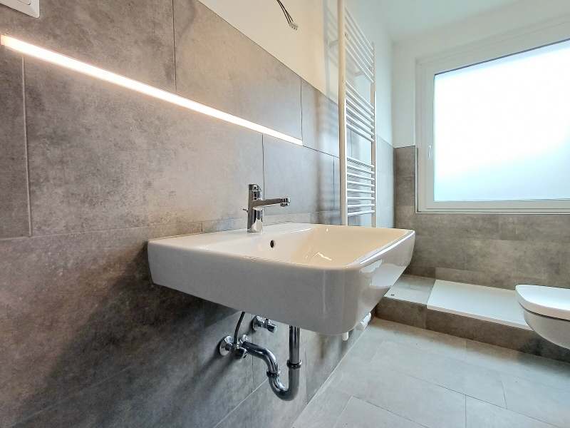 - Das Badezimmer ist hell gefliest und mit Dusche und Fenster ausgestattet